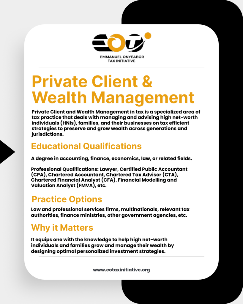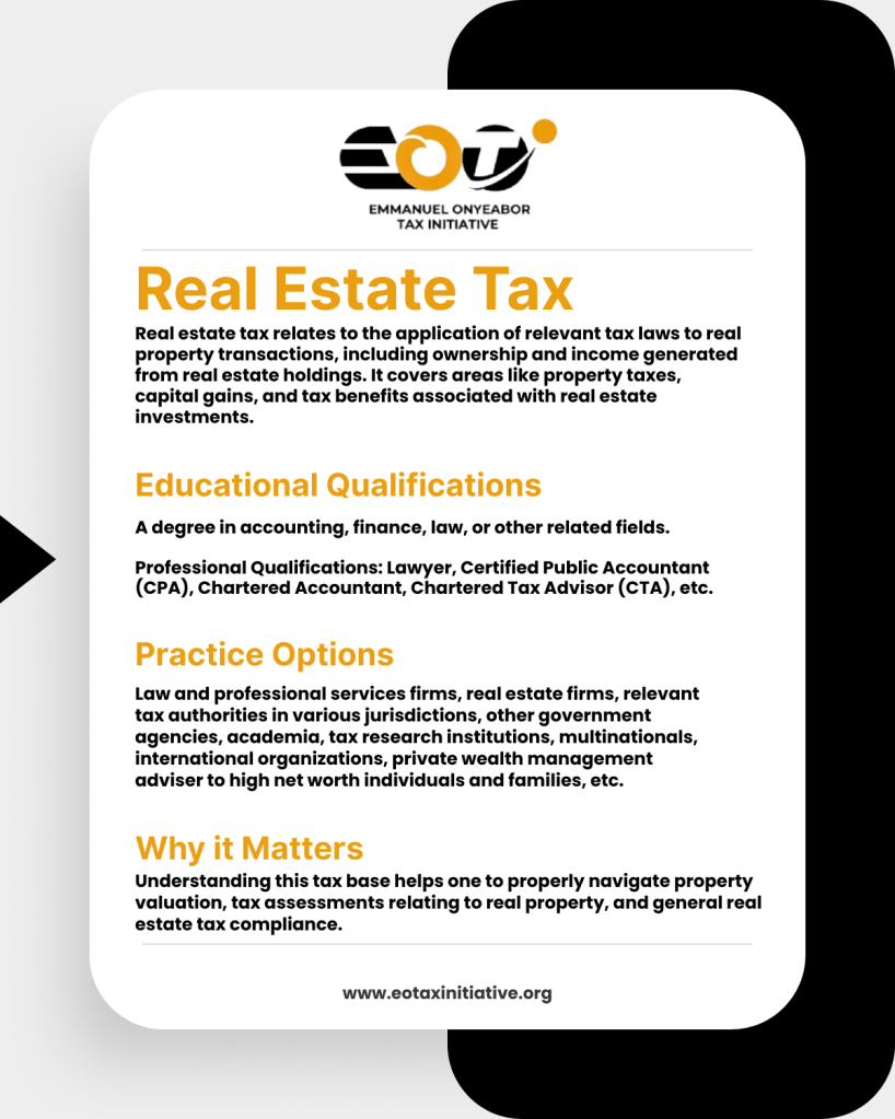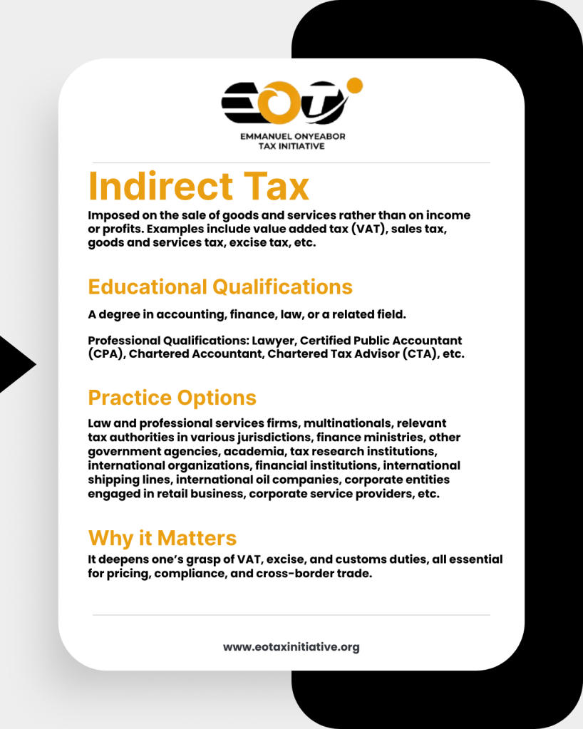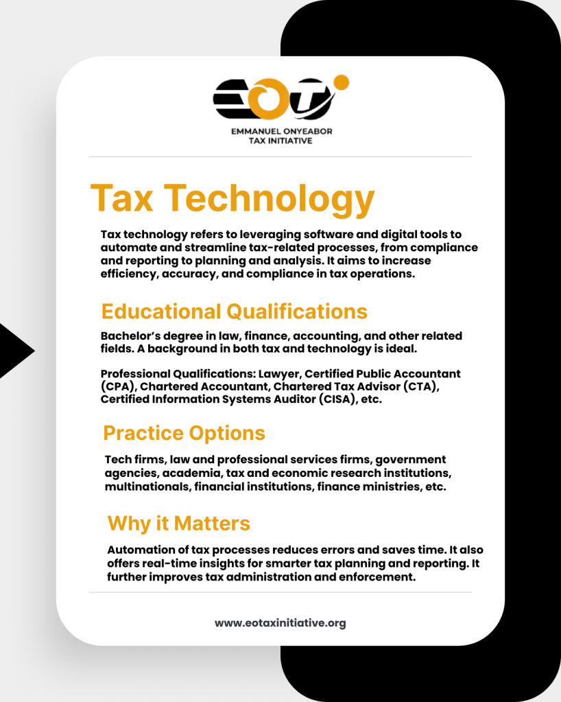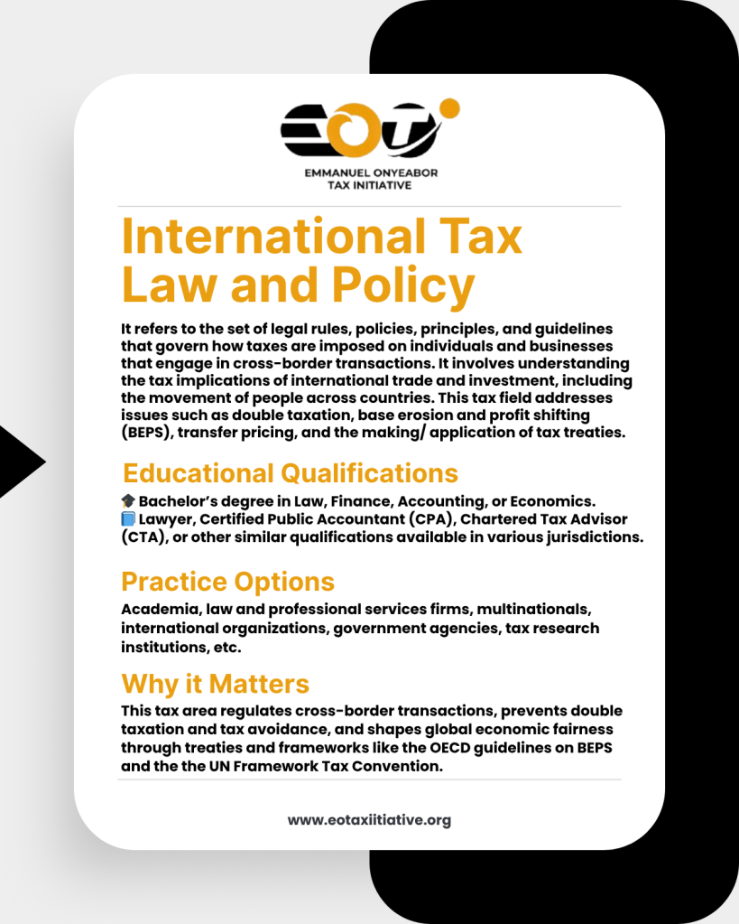 Whether you are a legal practitioner, law graduate, finance enthusiast, policy analyst, accounting professional, or business leader, there is a tax field where your interests, skills, and purpose can align. From International Tax Law & Policy to Transfer Pricing, Audit & Assurance, Real Estate Tax, Tax Technology, and Private Wealth Management, this resource is designed to help you make informed decisions as you navigate your professional journey in tax.