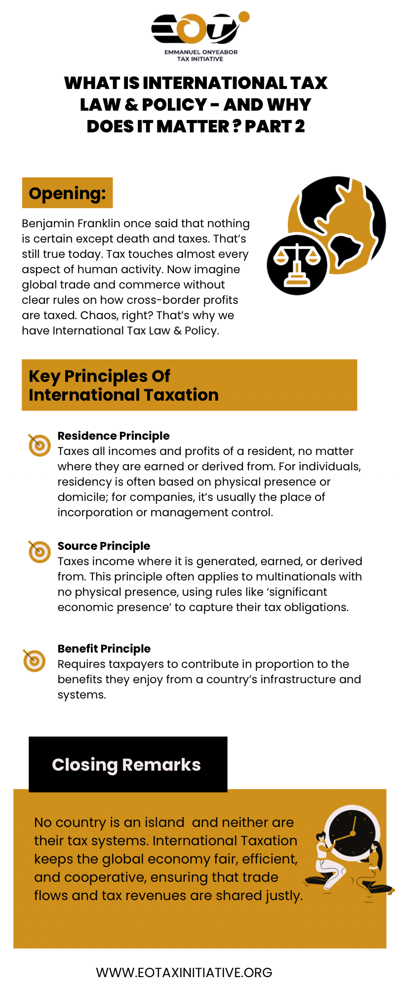 International taxation runs the world. Are you conversant with its principles? At EOTI, we are focused on the practical tax rules that shape the global tax landscape. We believe that the next generation of transnational tax leaders must be equipped with practical tax knowledge, cross-border tax exposure, and structured tax mentorship.
