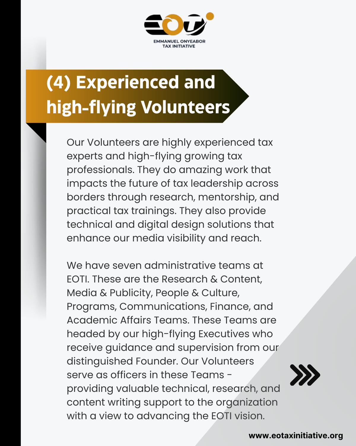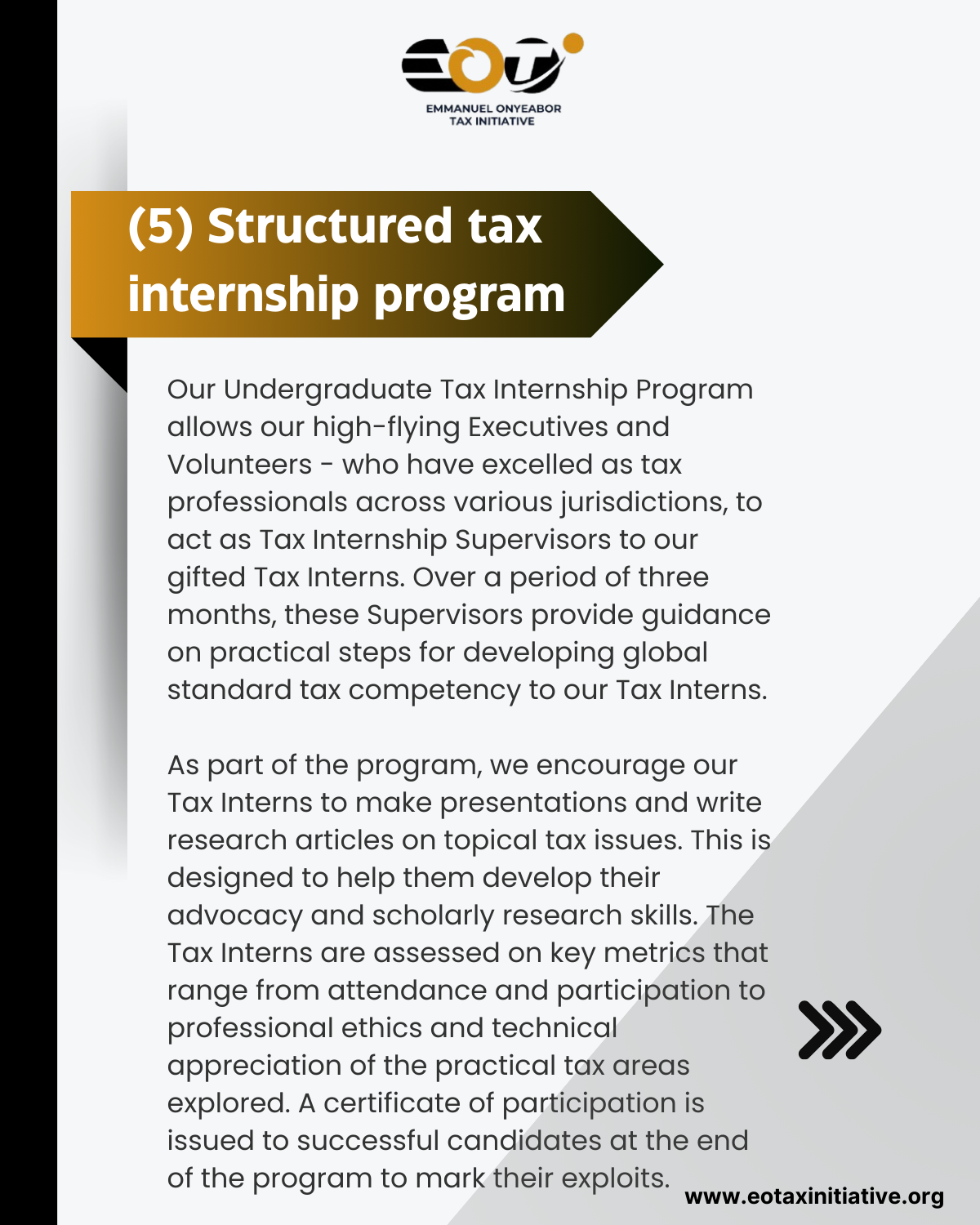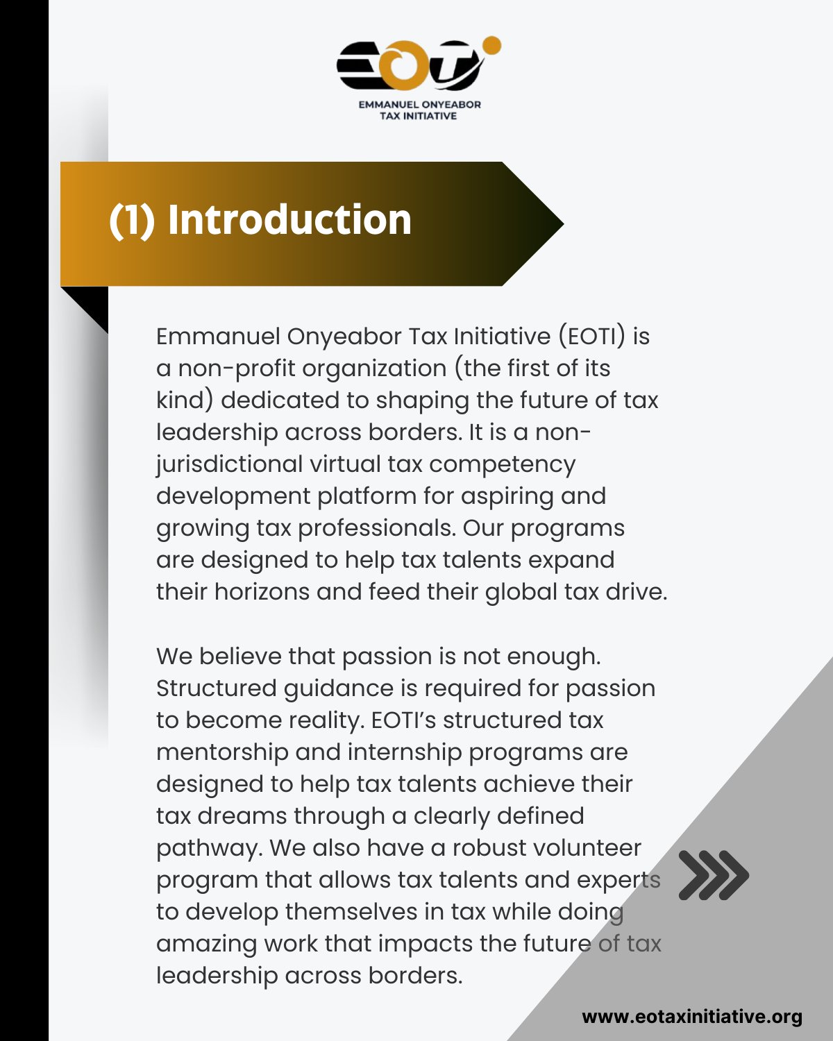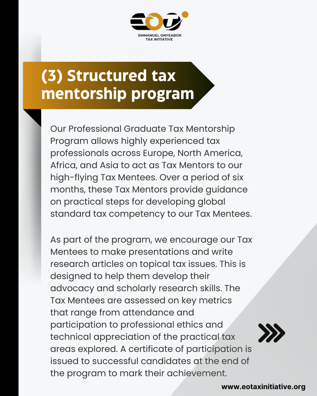 Our Tax Mentors, Executives, Volunteers, Tax Mentees, and Tax Interns choose EOTI because they are looking to effectively and efficiently give back to the tax community, grow their tax capacity, contribute meaningfully to shaping the future of tax leadership across borders, or simply step into the amazing world of tax. At EOTI, we believe that passion is not enough. Structured guidance is required for passion to become reality. EOTI’s structured tax mentorship and internship programs are designed to help tax talents achieve their tax dreams through a clearly defined pathway. We also have a robust volunteer program that allows tax talents and experts to develop themselves in tax while doing amazing work that impacts the future of transnational tax leadership.