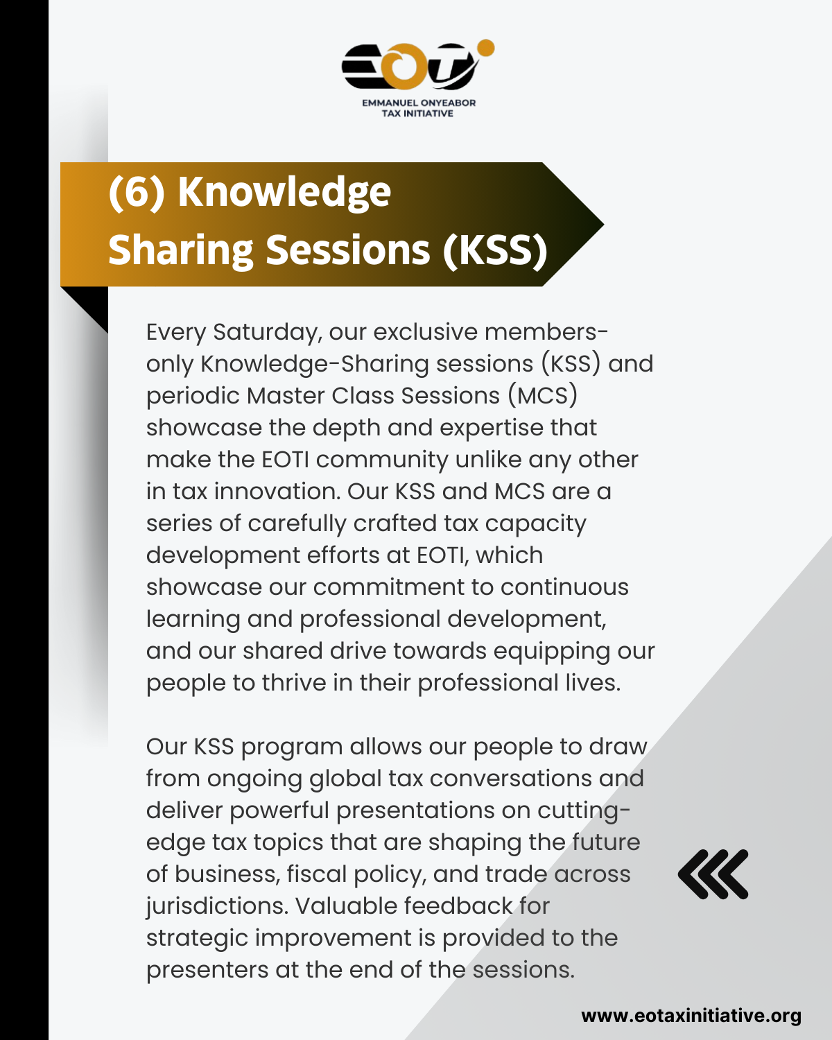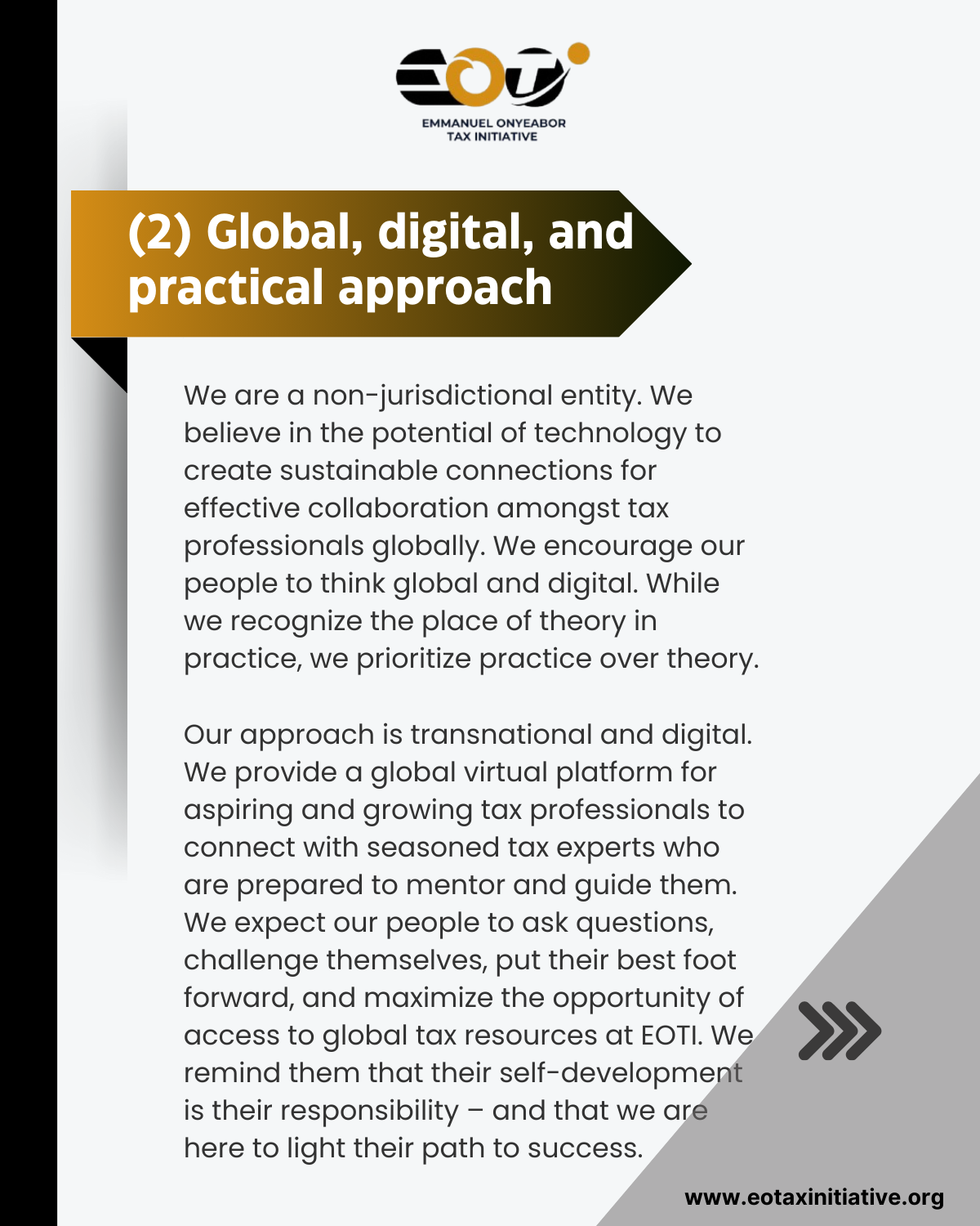 At EOTI, we take a global, digital, and practical approach to tax capacity development. Our programs are designed to help tax talents expand their horizons and feed their global tax drive. We are a non-jurisdictional entity. We believe in the potential of technology to create sustainable connections for effective collaboration amongst tax professionals globally. We encourage our people to think global and digital. While we recognize the place of theory in practice, we prioritize practice over theory.