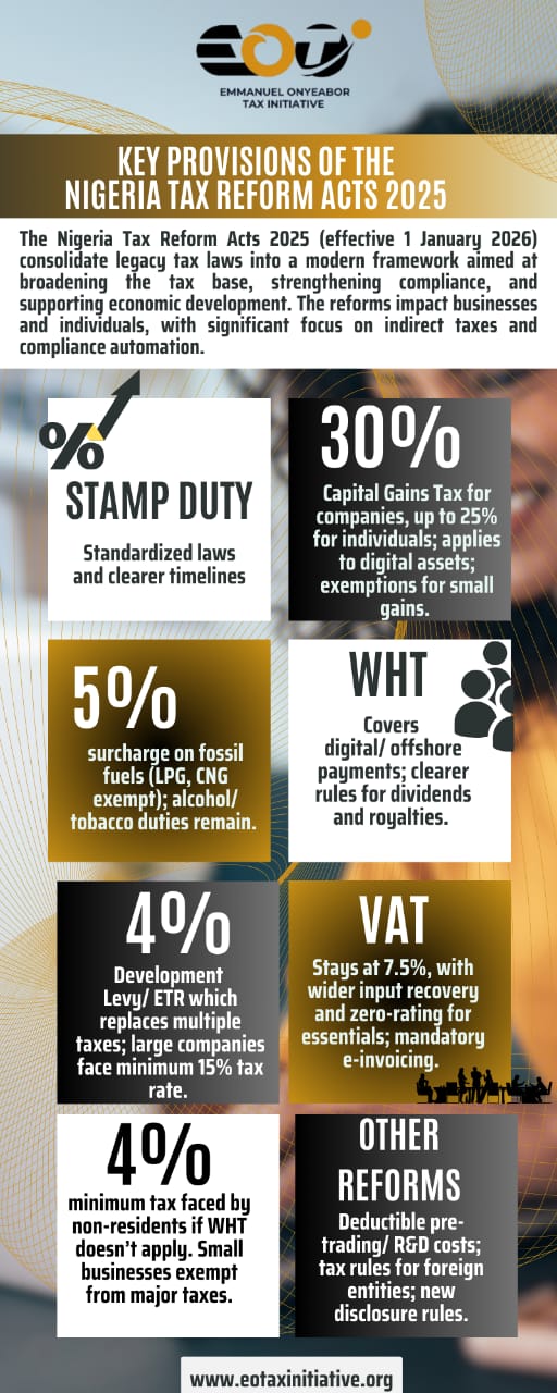 The Nigeria Tax Reform Acts 2025 (effective 1 January 2026) consolidate legacy tax laws into a modern framework aimed at broadening the tax base, strengthening compliance, and supporting economic development. The reforms impact businesses and individuals, with significant focus on indirect taxes and compliance automation.