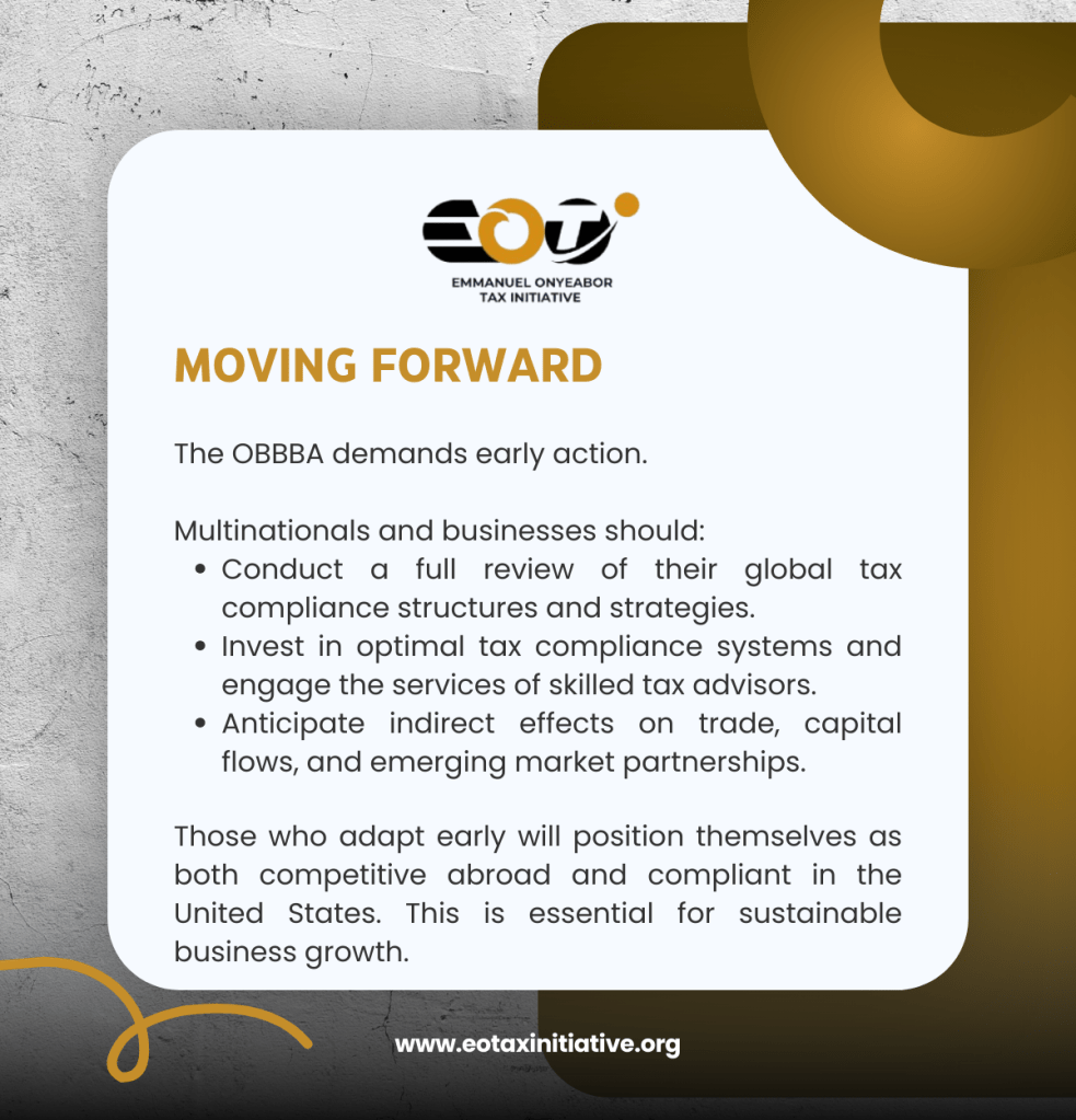 The OBBBA demands early action. Multinationals and businesses should: (i) conduct a full review of their global tax compliance structures and strategies; (ii) invest in optimal tax compliance systems and engage the services of skilled tax advisors; and (iii) anticipate indirect effects on cross-border trade, capital flows, and emerging market partnerships.