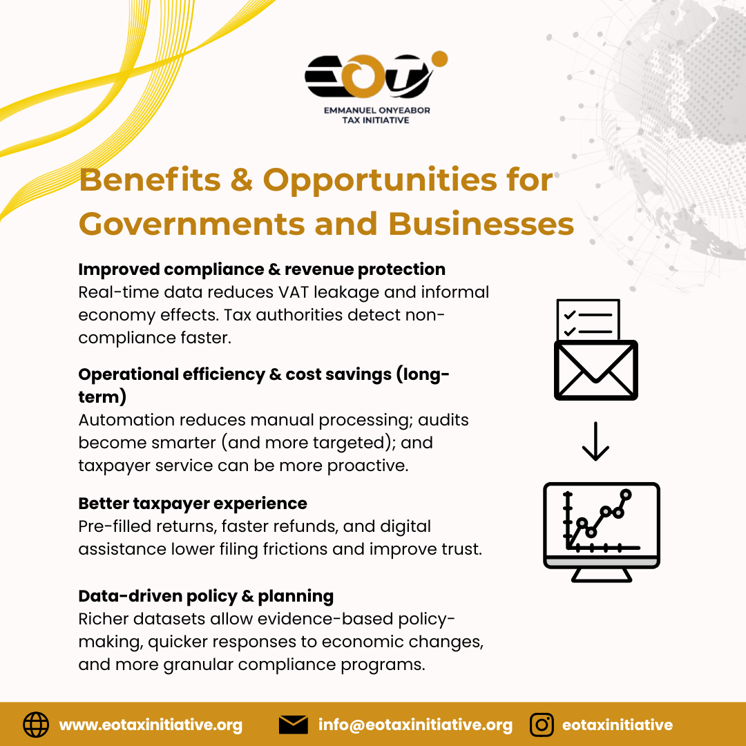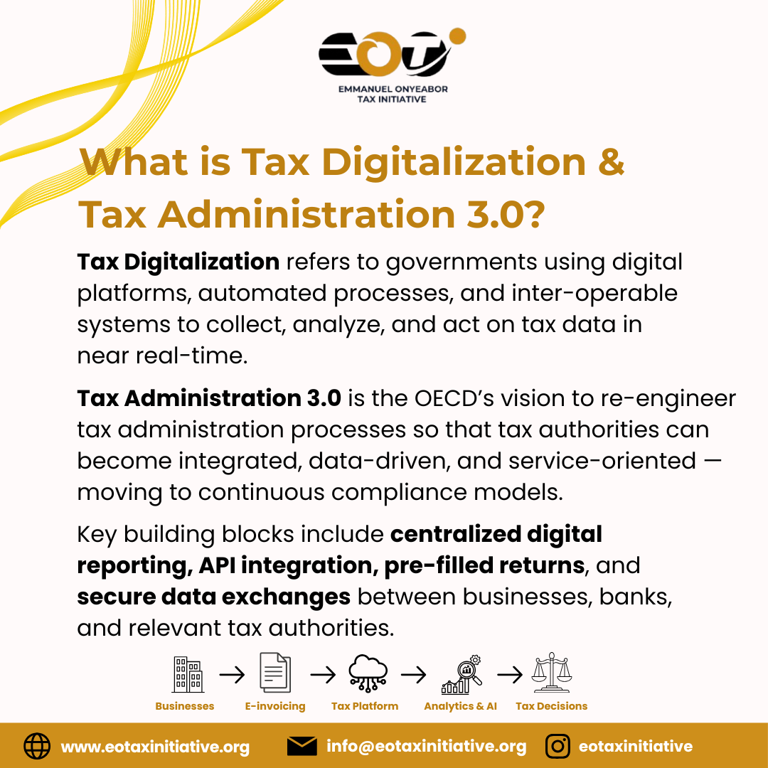 Tax Digitalization refers to governments using digital platforms, automated processes, and inter-operable systems to collect, analyze, and act on tax data in near real-time. Tax Administration 3.0 is the Organization for Economic Cooperation and Development (OECD)’s vision to re-engineer tax administration processes so that tax authorities can become integrated, data-driven, and service-oriented – moving to continuous compliance models. Key building blocks include centralized digital reporting, Application Programming Interface (API) integration, pre-filled returns, and secure data exchanges between businesses, banks, and relevant tax authorities.
